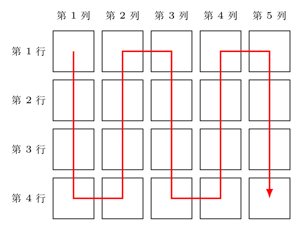 例如,若 n=4,m=5n = 4, m = 5,则所有 4×5=204 \times 5 = 20 名考生将按照 CSP-J 2025 第一轮成绩从高到低的顺序,根据下图中的箭头顺序分配座位。
