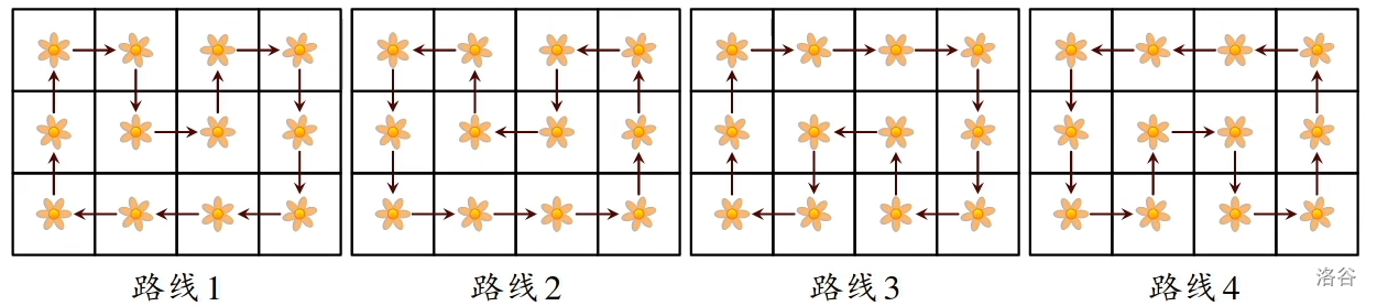 小蓝将多盆鲜花摆成一个 的矩阵,小蓝每天都会从左上角位置的花盆出发,给每一个花盆中的鲜花浇水。