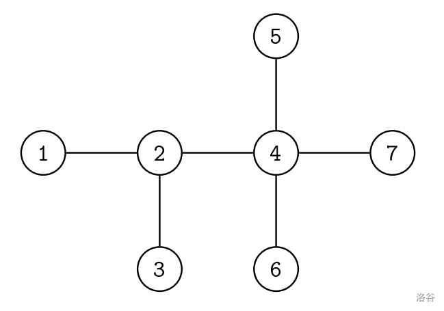 In this example, there are subtrees where the GCD of all its nodes' weight is not , i.e. seven subtrees of size , four subtrees of size , three subtrees of size , and one subtree of size (the largest). The largest subtree contains nodes , , , and , and the GCD of their weights is $\text{GCD}(A_4, A_5, A_6, A_7) = \text{GCD}(6, 10, 6, 4) = 2$.