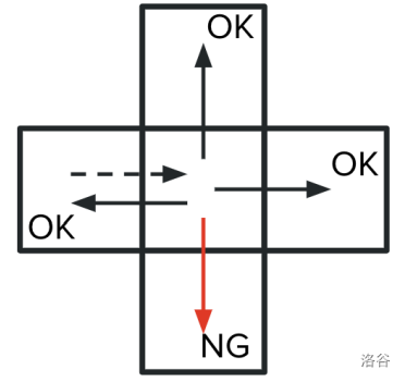 For example, in figure B.1., if the last move is along the dashed arrow, you cannot move downward but you can move the other three directions.