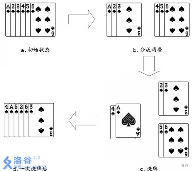 从图中可以看出经过一次洗牌,序列 变为 。当然,再对得到的序列进行一次洗牌,又会变为 。