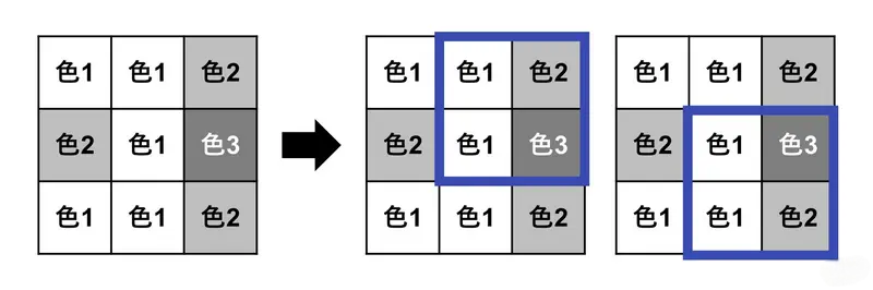 例如,下图中的海报的鲜艳程度为 ,因为存在 个满足上述条件的 子矩阵(已使用蓝框标出)。