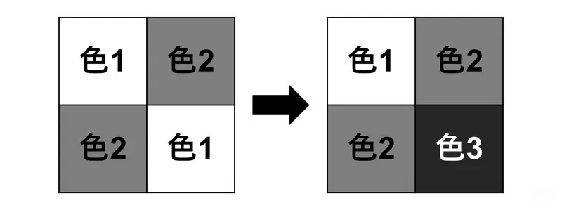 - 选择恰好一个格子 和一个与该格子原先颜色不同的颜色 ,将格子 的颜色改为 ,即 。