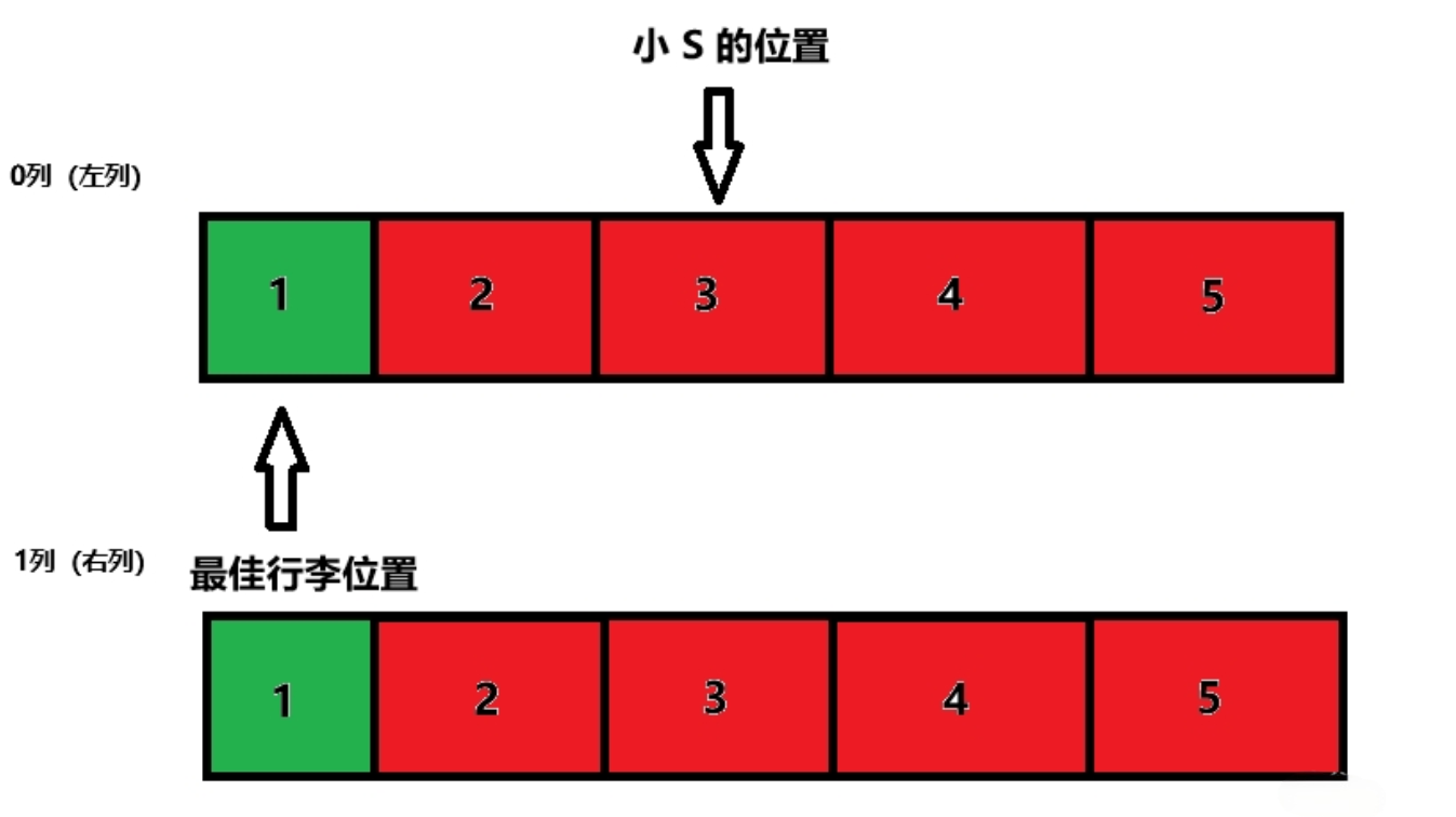 现在给你左右两列的行李摆放情况,请你找到一个满足条件的最佳行李摆放位置。如果没有任何空位置,请你输出 。