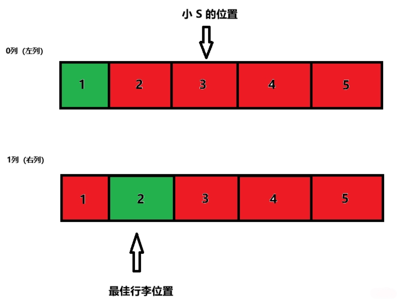 此时由于右列第 个位置距离小 S 更近,所以右列第 个位置是最佳位置,答案是 1 1 (表示这个位置在右列,和小 S 位置距离为 )。